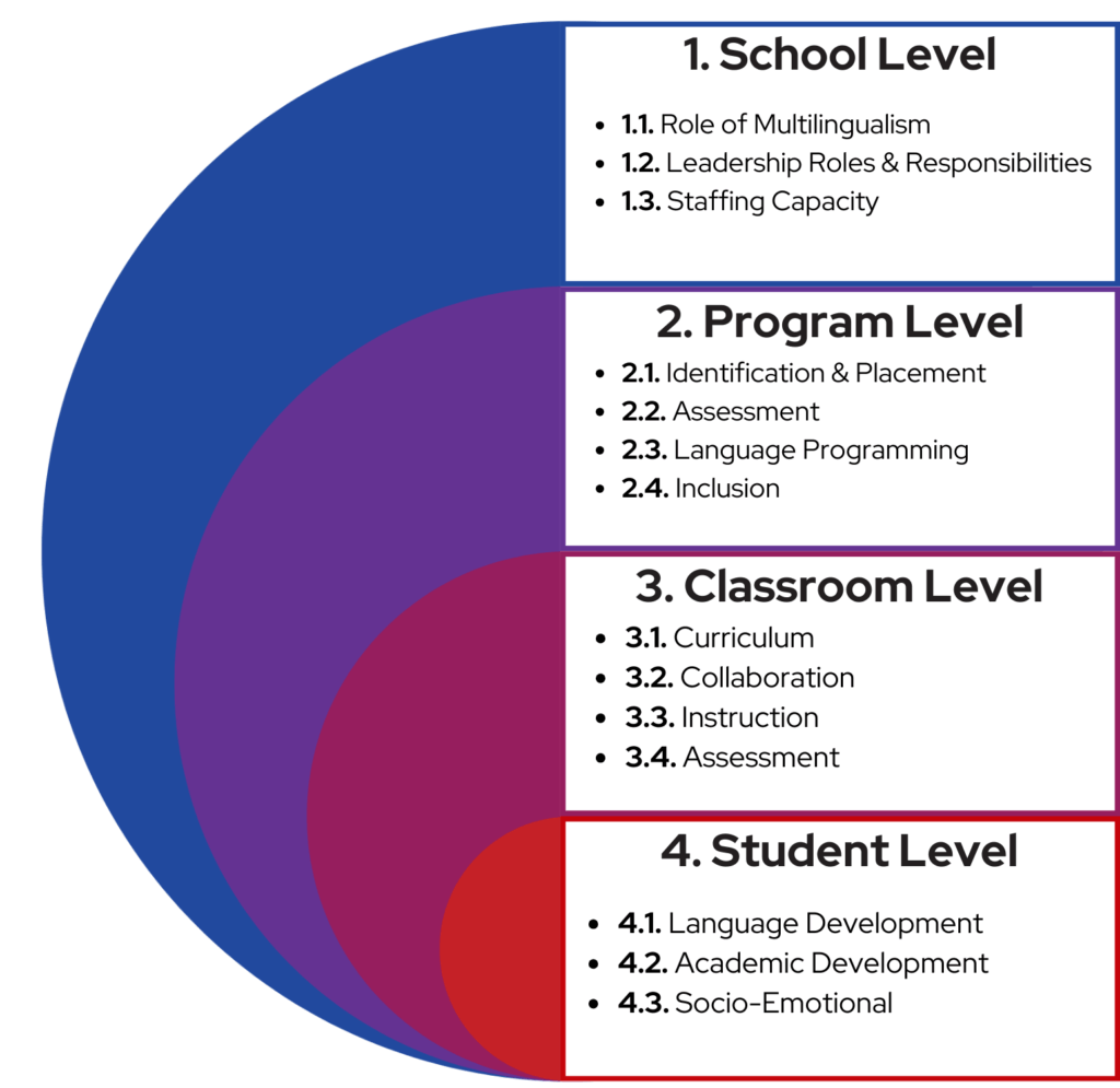 Four concentric circles, beginning with the outermost circle: 1. School Level 1.1 Role of Multilingualism 1.2 Leadership Roles & Responsibilities 1.3 Staffing Capacity; 2. Program Level 2.1 Identification & Placement 2.2 Assessment 2.3 Language Programming 2.4 Inclusion; 3. Classroom Level 3.1 Curriculum 3.2 Collaboration 3.3 Instruction 3.4 Assessment; 4. Student Level 4.1 Language Development 4.2 Academic Development 4.3 Socio-Emotional